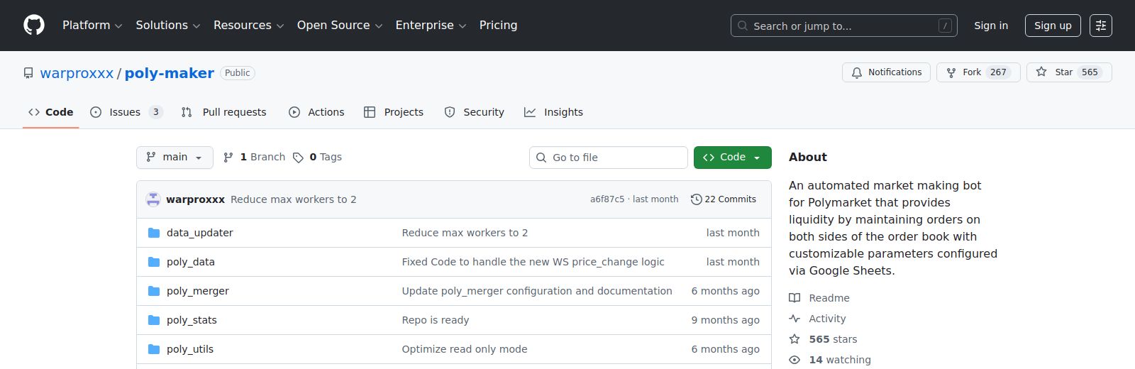 Open-source market-making bot repository providing automated liquidity for Polymarket order books.
